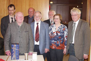 Der geehrte Karl Schmitt (vorn links) Reinhard Kahl, OV-Vorsitzende Erika Lotz, MdB Gerd Höfer. Zweite Reihe: Bürgermeister Uwe Ermisch, Hatzfelder Parlamentschef Günther Waßmuth und UB-Vorsitzender Karl-Heinz Stadtler.