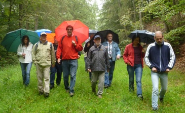 Es ging bergauf auf den 504 Meter hohen Dreimärker, wo die Grenzen von Battenberg, Bromskirchen und Allendorf aneinander stoßen, wobei das Wetter immer schlechter wurde. Anschließend wieder bergab in den Nitzelgrund. Danach folgte ein weiterer Aufstieg entlang der Frewertwiese bis zum 564 Meter hohen Sattel zwischen den Bergen Neuneichen und Knöbelsroth. Dieses war der höchste Punkt des Grenzganges. Dann ging es wieder hinab in das Tal im Elbrighäuser Grund.