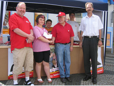 Die Schülerin Jessica Hess ist das jüngste Mitglied im SPD-Ortsverein Frankenberg. MdL Reinhard Kahl überreichte ihr am Stand der Frankenberger SPD das rote Parteibuch und begrüßte sie als neues Mitglied. Jessica packte sofort an und verteilte Infomaterial an die vorbeigehenden Bürgerinnen und Bürger.