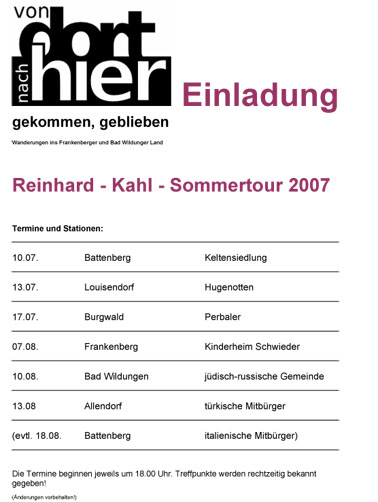 Die alljährliche Sommertour des SPD-Wahlkreisab- geordneten Reinhard Kahl steht in diesem Jahr unter dem Motto „Von dort nach hier“, Wanderungen ins Frankenberger und Bad Wildunger Land. Das Thema im vergangenen Jahr waren „Brücken“ und erreichte über 300 interessierte Bürgerinnen und Bürger. Reinhard Kahl bedankt sich auf diesem Wege bei allen, die diese Tour durch ihre großartige Kooperation so erfolgreich gemacht haben.