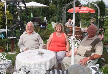 Vor Beginn der Sommertour in Hatzfeld Kurzbesuch bei Sieglinde Schneider, die zusammen mit ihrem Lebensgefährten ein Café in einem Gartenpark bei Laisa betreibt