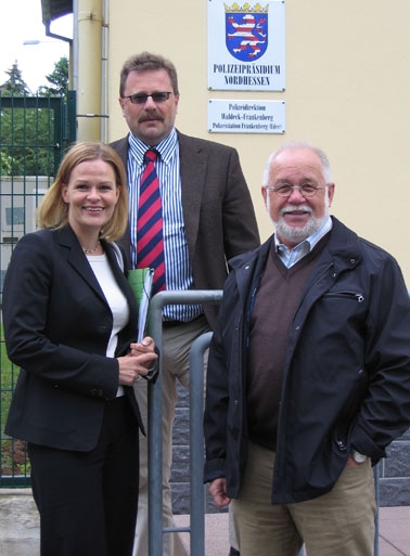 MdL Nancy Faeser, MdL Reinhard Kahl und der Referent der SPD-Landtagsfraktion Ralf Sturm vor dem Eingang der Polizeistation in Frankenberg