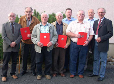 Für 40jährige Mitgliedschaft geehrt: Wilhelm Daume, Walter Debus, Manfred Ritter und Werner Würfel. MdL Reinhard Kahl, Landratskandidat Dr. Reinhard Kubat, Ortsvereinsvorsitzender Burkhard Wilhelmi und Kreistagsabgeordneter Wilhelm Schäfer gratulieren.