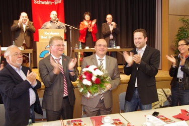 Mit einem Blumenstrauß zur Nominierung gratulierte der Landrat des Schwalm-Eder Kreises Frank-Martin Neupärtel dem Bundestagsabgeordneten Dr. Edgar Franke im voll besetzten Kurhaus in Bad Zwesten.