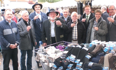 "Socken Sepp" (Standbetreiber), D. Gasse (Ortsvorsteher und Marktleiter), C. Junghenn (Bgm. Allendorf), W. Groh (Ehrenmarktleiter), L. Koch (Bgm. Burgwald), R. Kahl (MdL), H. Horsel (Bgm. Battenberg), C. Ravensburg (MdL),