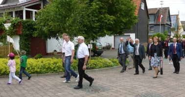 Bei sonnigem Wetter winkten die Abgeordneten den Zuschauern zu. Neben ihnen die stellvertretende Vorsitzende der Gemeindevertretung Rosel Krafthöfer