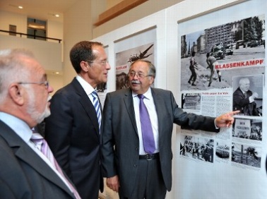 Im Anschluss an die Reden folgte ein gemeinsamer Rundgang durch die Ausstellung der Bundesstiftung Aufarbeitung: v.l.n.r. Reinhard Kahl, Mitglied des Hessischen Landtags und Vorsitzender des Kuratoriums der Landeszentrale für politische Bildung, Staatsminister Axel Wintermeyer, Präsident des Hessischen Landtags, Norbert Kartmann (Foto: H. Heibel)