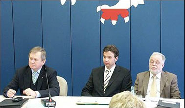 Der ungarische Botschafter Dr. Sandor Peisch (links) bei der SPD-Landtagsfraktion in Wiesbaden, daneben Fraktionsvorsitzender Jürgen Walter und der parlamentarische Geschäftsführer Reinhard Kahl.