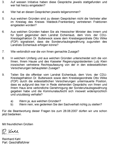 Nach Kahls Ansicht stünde jetzt der Innenminister in der Pflicht, Erhellendes zur weiteren Sachverhaltsaufklärung beizutragen. Aus diesem Grund habe die SPD-Fraktion einen Fragenkatalog an den Minister gerichtet und um Antwort bis 28. August gebeten.