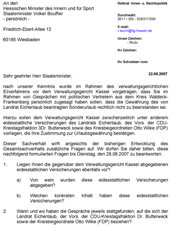 Eidesstattliche Versicherungen lokaler CDU-Größen aus dem Landkreis Waldeck-Frankenberg belasten Innenminister Bouffier schwer / SPD will Antworten bis 28. August