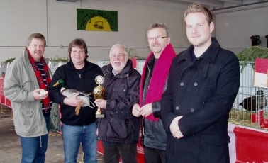 Reinhard Kahl übergibt den von ihm gestifteten Pokal an Züchter und Ausstellungsleiter Thomas Wagener. Mit dabei Walter Mombrei (l.), sowie die Kreistagskandidaten Rainer Paulus (2.v.r.) und Marius Gille (r.)