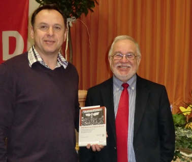 Landtagsabgeordneter Reinhard Kahl überreicht in seiner Eigenschaft als Vorsitzender des Kuratoriums der Landeszentrale ein Exemplar der Schrift Waldeck im Dritten Reich an den Vorsitzenden des Geschichtsverein Itter-Hessenstein, Volker König